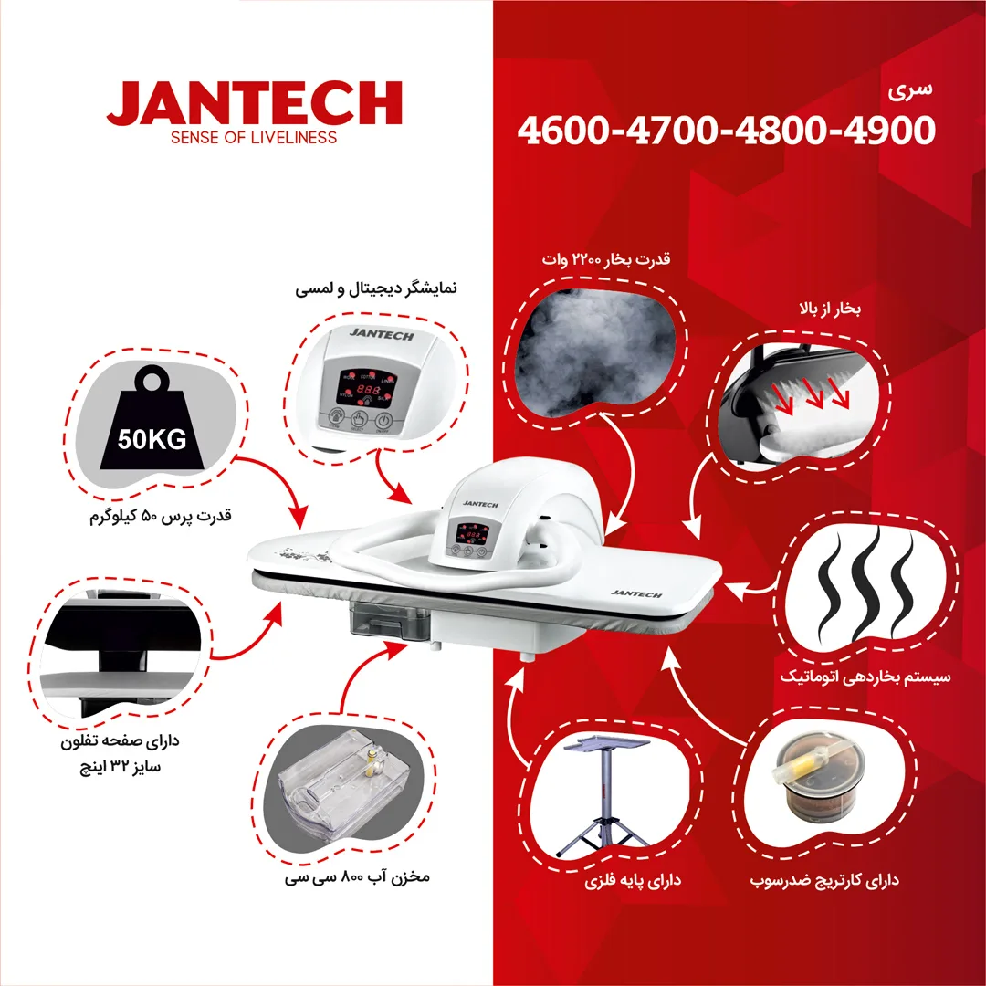 اتو پرس جانتک مدل 4600-4700-4800-4900 دارای مشخصات فنی یکسانی میباشند و تفاوت آنها در رنگ دستگاه میباشد.