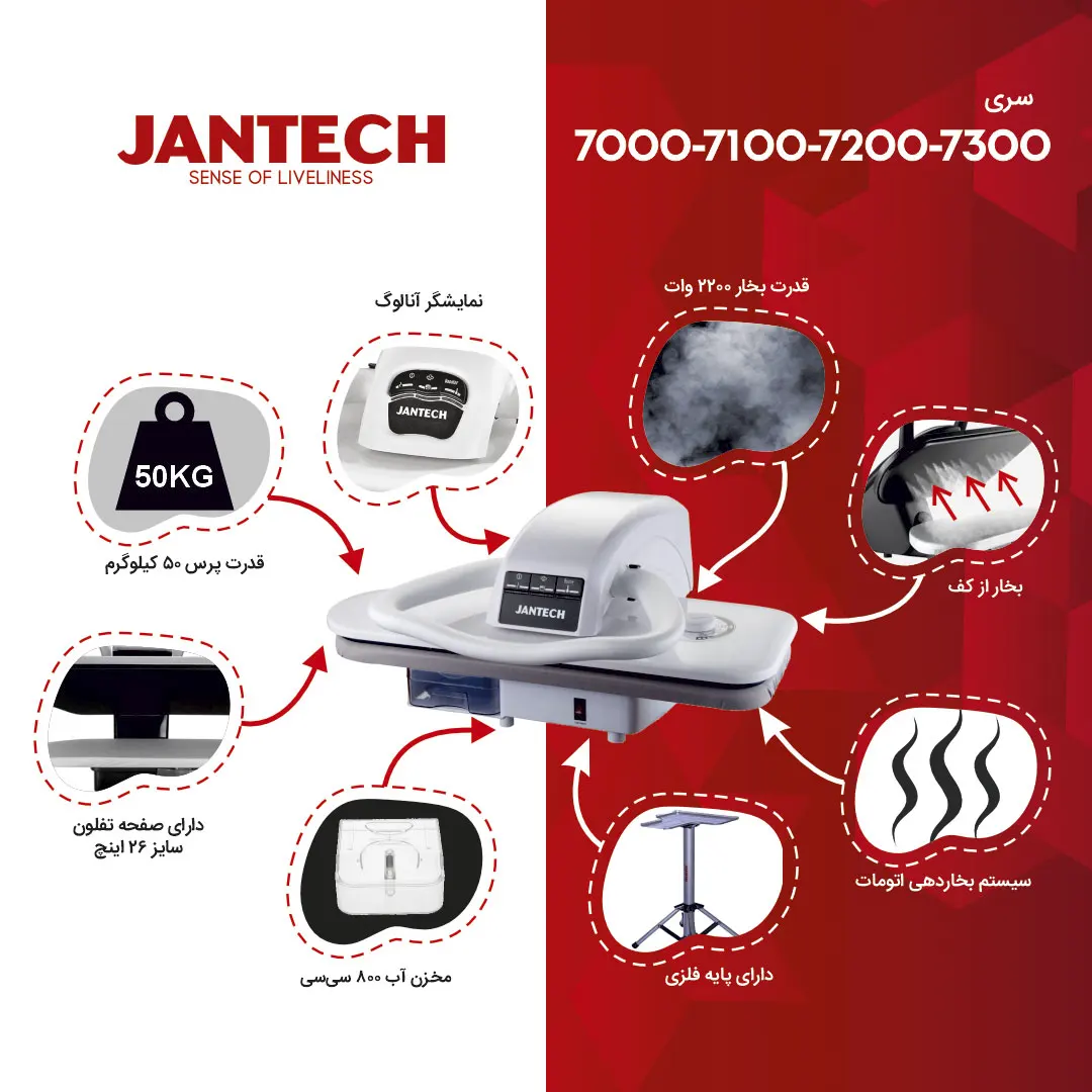 اتو پرس جانتک مدل 7000،7100،7200،7300 دارای مشخصات فنی یکسانی میباشند و تفاوت آنها در رنگ دستگاه میباشد.