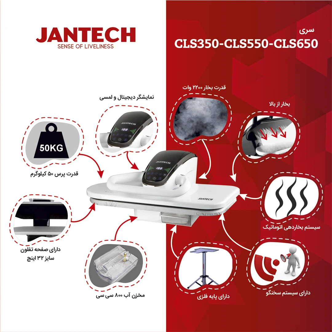 اتو پرس جانتک CLS350-CLS550-CLS650 دارای مشخصات فنی یکسانی میباشند و تفاوت آنها در رنگ دستگاه میباشد.