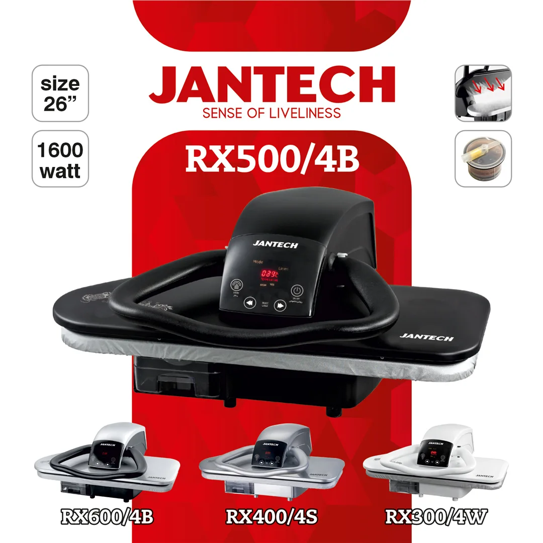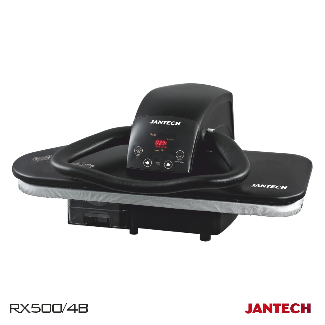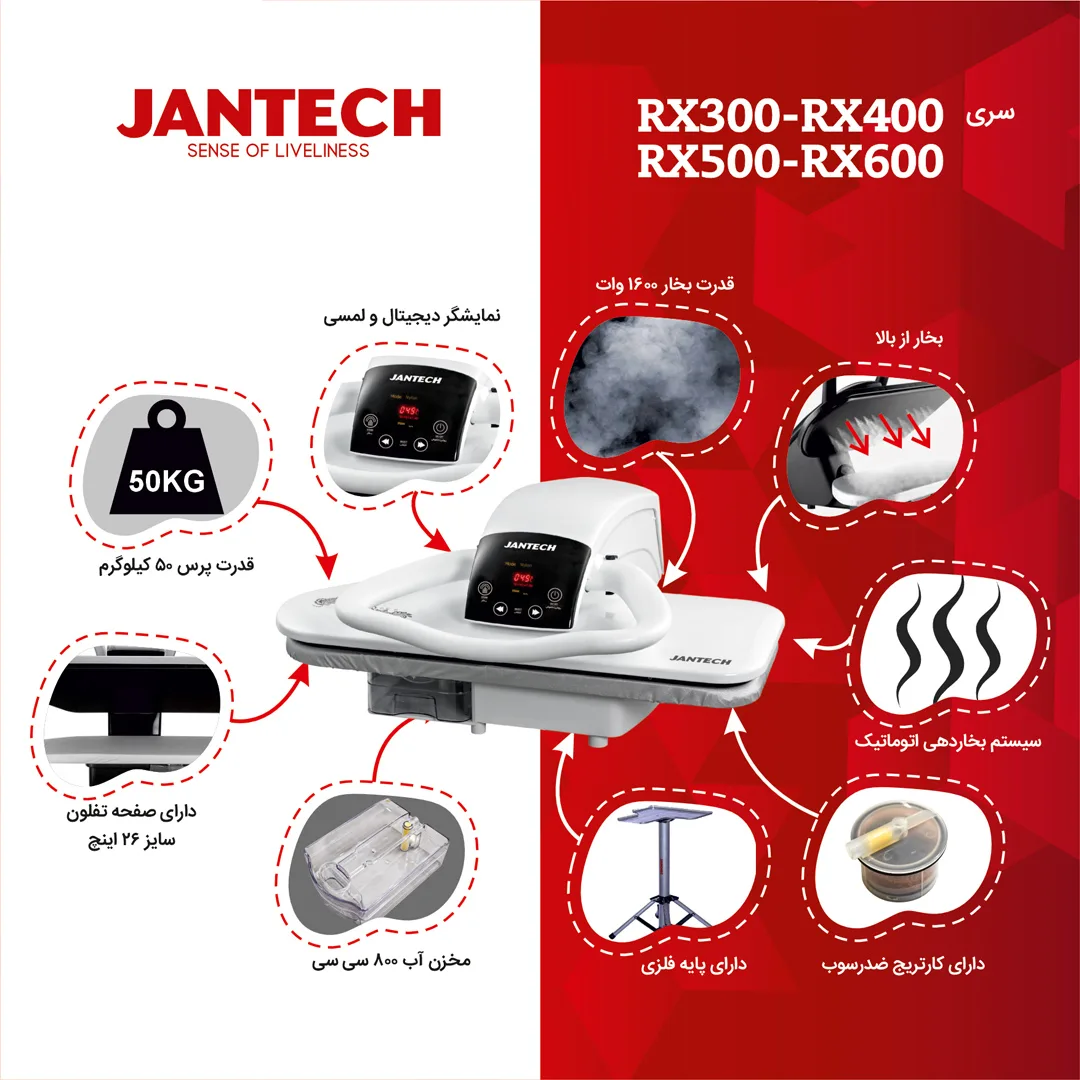 مشخصات اتوپرس ژانومه و جانتک مدل RX500 خروجی بخار 120گرم بر دقیقه اندازه طول صفحه 26 اینچ 70 سانت قدرت پرس 50kg نمایشگر دیجیتال مجهز به فیلتر ضد رسوب مجهز به کنترل کننده مواد معدنی EMC بخار هوشمند بوستر تقویت بخار سیستم بخار از بالا جنس کفه فلز جنس صفحه بالا تفلون 800ccحجم مخزن آب
